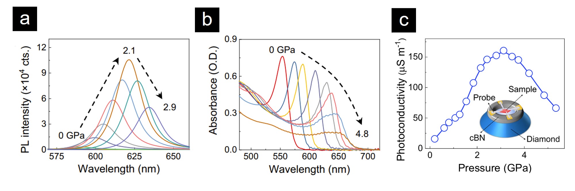 圖3,不同壓力下的二維鈣鈦礦光電性能:(a) PL;(b) 吸收;(c) 光電導(dǎo)率