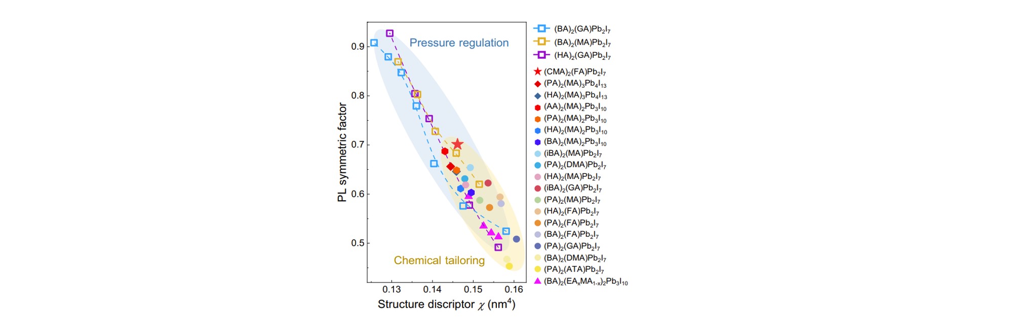 圖4,多種二維RP鈣鈦礦結(jié)構(gòu)描述符與PL對(duì)稱(chēng)因子在壓力調(diào)制下的關(guān)聯(lián)