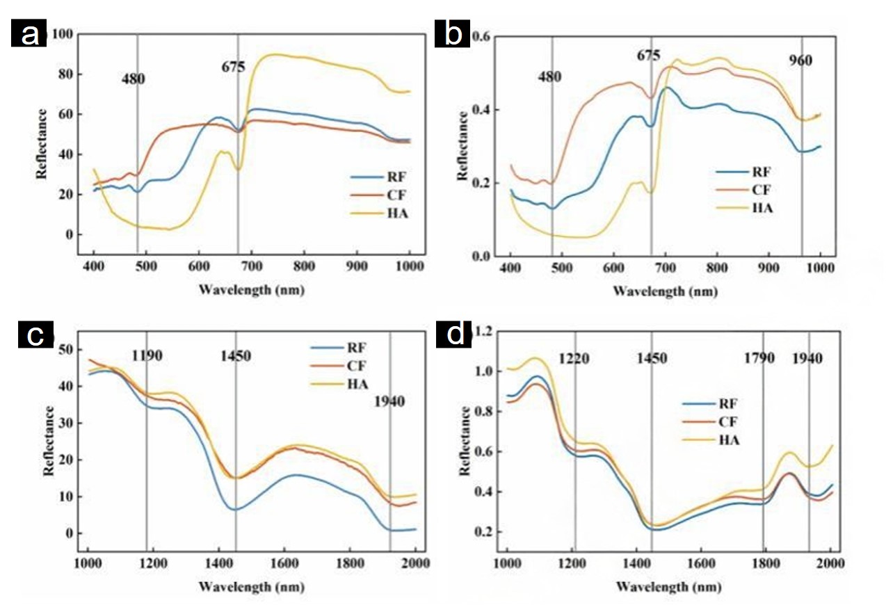 水果產品的視覺顏色取決于葉綠素、胡蘿卜素、葉黃素、花青素和其他酚類色素的類型和含量。根據 Vis-NIR 波長區域(400~1000nm)曲(圖3a 和 3b),可以推斷約 480nm 的吸收來自花青素, 675nm 處的吸收來自葉綠素。HA蘋果在 400~675nm 區域的吸收能力強于 RF 和 CF蘋果,說明 HA 的色素含量更高。結果表明,3個品種的蘋果在 400~600nm 之間的反射率存在顯著差異。