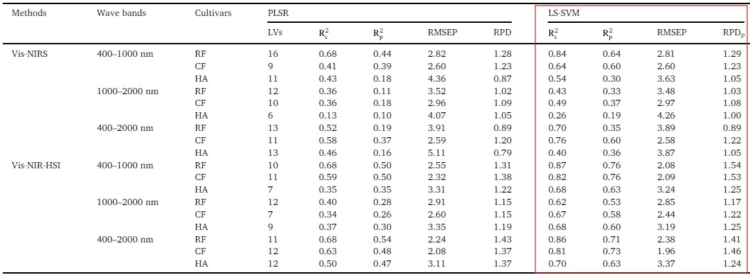 作者采用用偏最小二乘回歸(PLSR)和最小二乘支持向量機(LS-SVM)算法建立模型,隨后導入Vis-NIR “點”光譜和 Vis-NIR 成像光譜進行硬度分析,并成功輸出評價參數,通過比較數值可以發現 LS-SVM模型對蘋果硬度的預測效果更優。