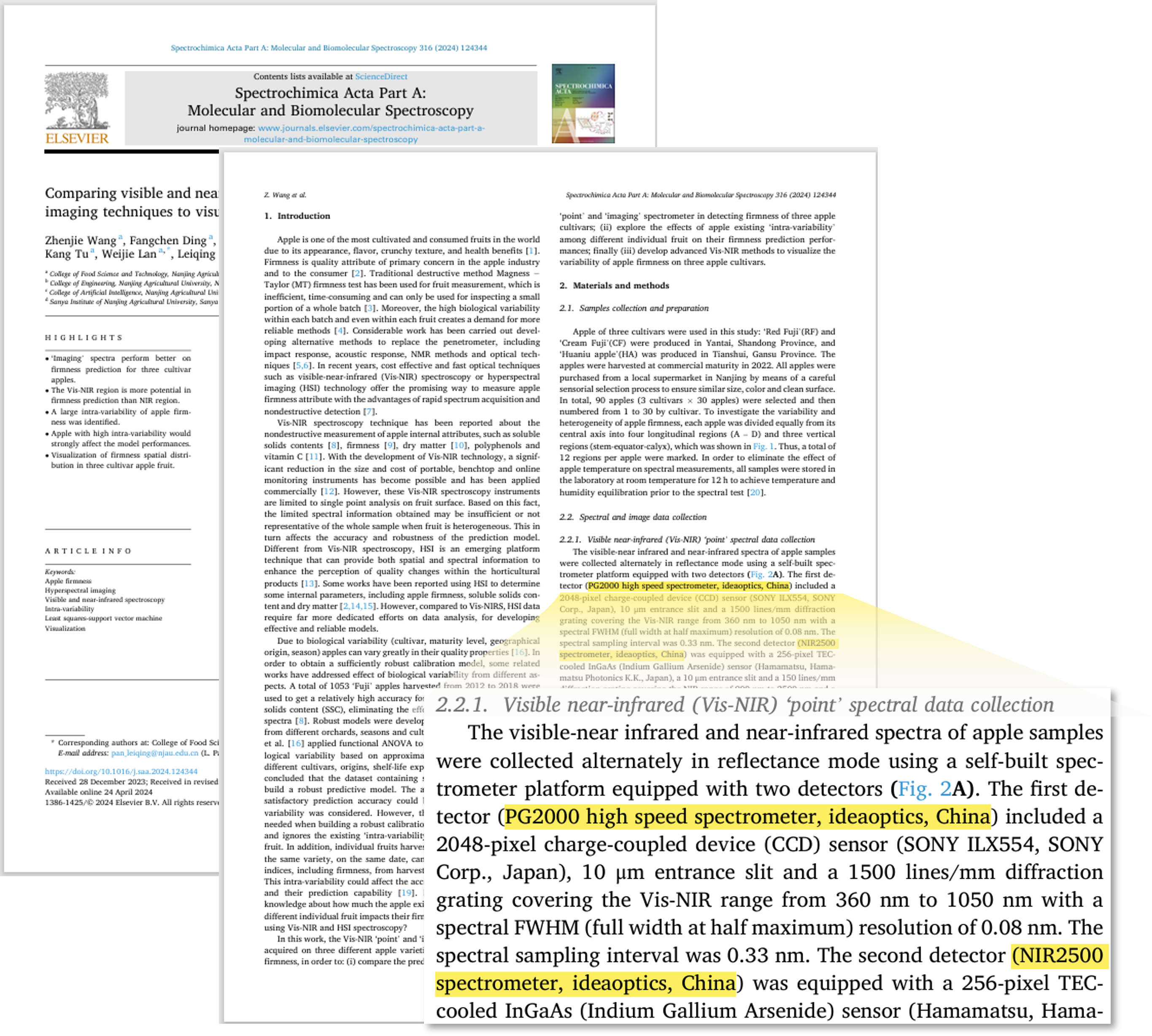 【參考文獻】       ? Wang Z, Ding F, Ge Y,;et al. Comparing visible and near infrared ‘point’spectroscopy and hyperspectral imaging techniques to visualize the variability of apple firmness. Spectrochimica Acta Part A: Molecular and Biomolecular Spectroscopy (2024).  Link