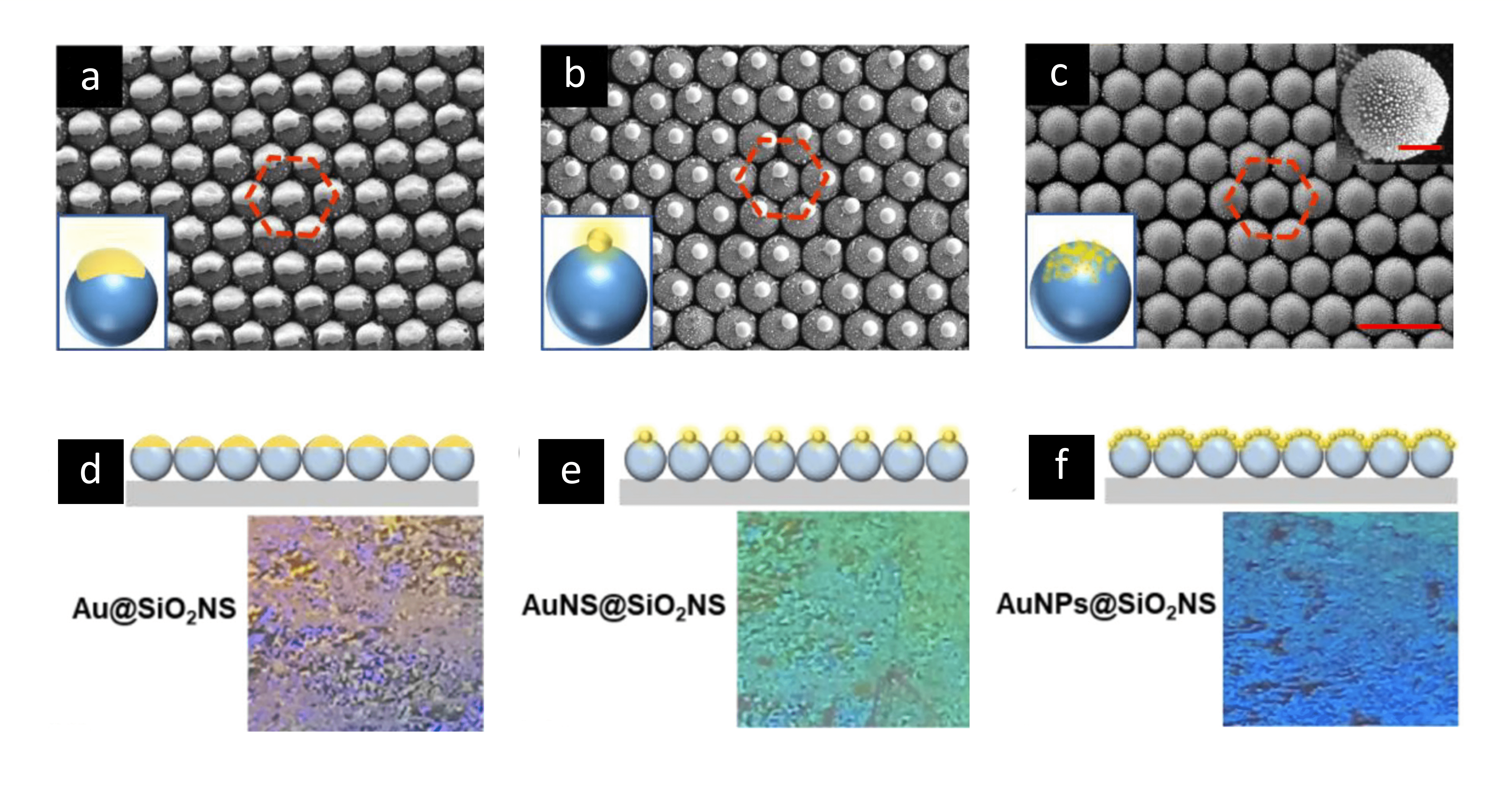 2022年,華南師范大學姜小芳、水玲玲教授團隊在 Nanophotonics 上發表了一篇題為《Programmable hierarchical plasmonic–photonic arrays via laser-induced film dewetting》的文章。作者結合自組裝與激光誘導這一方法制備了 3 種金納米結構。從理論和實驗兩方面研究了其光學性質,并闡述了該材料在防偽及信息加密等領域的應用潛力。              【樣品 & 測試】作者先采用自組裝工藝制備了高質量的單層 SiO2NS 陣列,在陣列上方涂覆了一層金膜,隨后通過控制激光強度制備了 3 種不同金膜厚度的納米結構,分別是 Au@SiO2NS、AuNS@SiO2NS 和 AuNPs@SiO2NS,如圖2 所示。