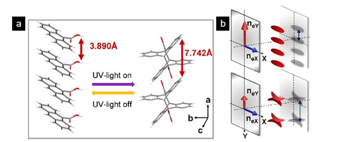 圖1,(a)光場(chǎng)調(diào)控前后的有機(jī)晶體分子排布及(b)晶體折射率變化差異