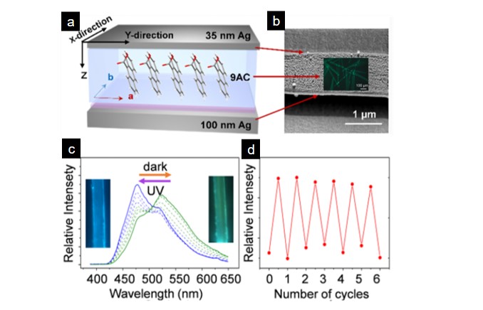 圖2,(a)有機(jī)微腔的結(jié)構(gòu)示意圖;(b)所構(gòu)建的微腔掃描電鏡(SEM)示意圖,(c)405nm激發(fā)的微腔PL光譜,其中初始時(shí)為綠色發(fā)射峰,隨照射時(shí)間增加后逐漸變?yōu)樗{(lán)色峰,代表 SOC 態(tài)消失;(d)循環(huán)PL激發(fā)
