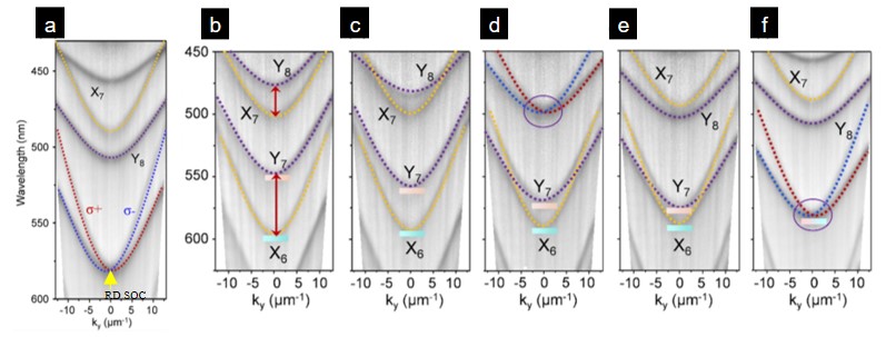 9AC 單晶分子具有光致異構(gòu)特性,長(zhǎng)程有序的排列方式使其具有較大的雙折射差異,可在微腔中產(chǎn)生 Rashba?Dresselhaus SOC 且易被光場(chǎng)調(diào)控。圖3 為樣品經(jīng)紫外光照射后的顯微角分辨反射光譜表征結(jié)果及對(duì)應(yīng)的模擬色散曲線,其中,圖3a 中觀察到兩組圓偏振分裂的光學(xué)模態(tài)(藍(lán)色和紅色),對(duì)色散模擬計(jì)算得到其折射率分別為 1.90 和 2.50,說(shuō)明 9AC 微帶具有巨大的光學(xué)各向異性,并觀察到 Rashba?Dresselhaus SOC 誘導(dǎo)的持續(xù)自旋螺旋出現(xiàn)在腔內(nèi); 圖3b~f 分別為停止紫外光照 0、8、16、25、35 min 后的角分辨反射譜, 圖3b 中激光照射使得 9AC 單體經(jīng)歷[4+4]環(huán)化反應(yīng),二聚體數(shù)量逐漸增多,腔膜的折射率發(fā)生變化, Rashba?Dresselhaus SOC 特征消失,并在撤除激光照射 35min 后恢復(fù),使得圓偏振模式轉(zhuǎn)換為線偏振模式,證明了基于光場(chǎng)調(diào)控 SOC 的有效性。