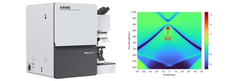 在光場(chǎng)調(diào)控微腔性質(zhì)的相關(guān)研究中,腔內(nèi)光學(xué)模式的角分辨光譜表征是內(nèi)在機(jī)理研究的重要方式和證明手段。復(fù)享光學(xué)的顯微角分辨光譜儀ARMS,是全球唯一一款基于 FT-ARS 技術(shù)且經(jīng)過(guò)嚴(yán)格工程化開(kāi)發(fā)的顯微角分辨光譜產(chǎn)品,可在多種測(cè)量模式下快速準(zhǔn)確獲得動(dòng)量空間中的光學(xué)模式,幫助用戶更簡(jiǎn)單、更清晰地研究微腔相關(guān)材料的動(dòng)量空間光學(xué)特性。ARMS 在研究以上問(wèn)題中具有以下特點(diǎn):豐富的測(cè)量模式,支持反射、透射、偏振等多種顯微角分辨光譜測(cè)量模式,同時(shí)適配用戶不同場(chǎng)景的測(cè)試需求;精細(xì)的角度分辨能力,角度分辨率可達(dá) 0.5°;超寬光譜探測(cè)能力,最高可實(shí)現(xiàn) 400~1650nm 的光譜測(cè)量;瞬態(tài)光譜采集能力,毫秒級(jí)(ms)實(shí)現(xiàn)角分辨光譜檢測(cè)。圖4 展示了利用 ARMS 進(jìn)行光子晶體的光子模式表征,從該結(jié)果中可清晰觀測(cè)到光子能帶在 Γ 點(diǎn)處明顯的 BIC 現(xiàn)象。